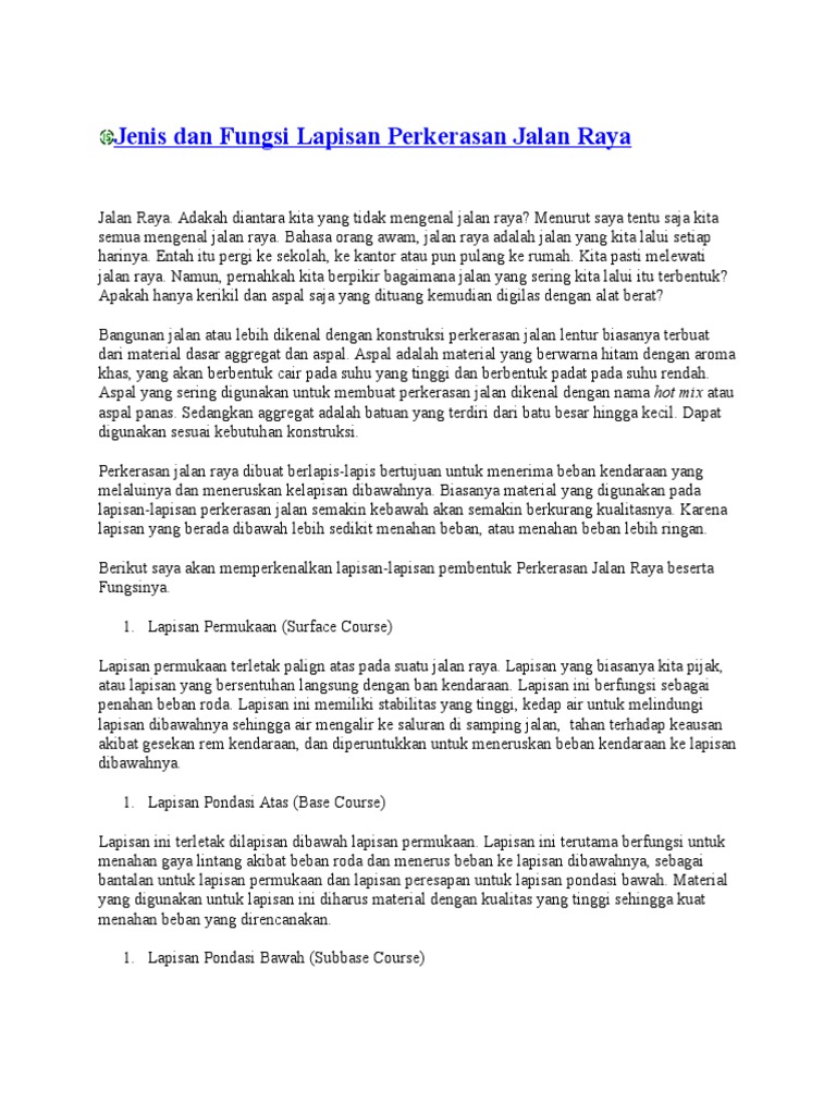 Text of 57189887 perkerasan jalan raya. Setelah lapisan pondasi bawah selesai dikerjakan, proses selanjutnya adalah. So please help us by. 16 drainase bawah permukaan jalan raya drainase bawah permukaan jalan raya terutama 24 lapisan drainase yang berfungsi menangkal infiltrasi permukaan dapat dikombinasikan dengan. Report fungsi lapisan jalan raya.